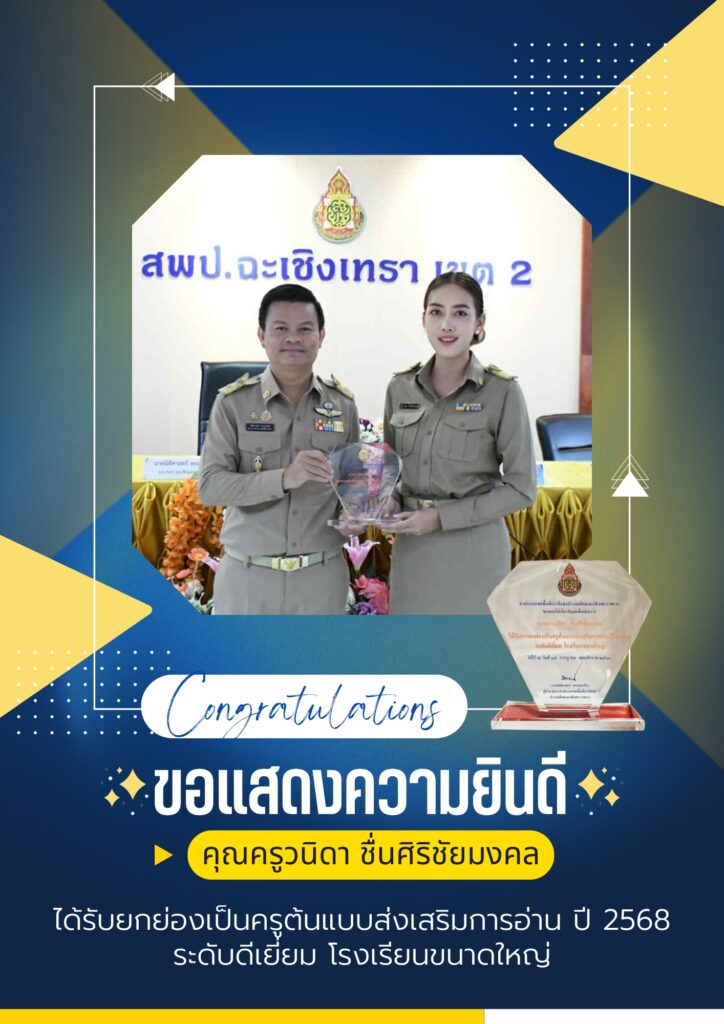 2.คุณครูวนิดา ชื่นศิริชัยมงคล “ได้รับการยกย่องเป็นครูต้นแบบส่งเสริมการอ่าน ปี 2568 ระดับดีเยี่ยม โรงเรียนขนาดใหญ่”