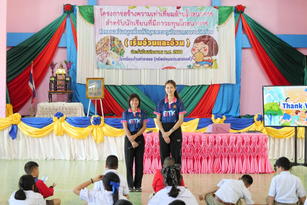 วันนี้ 17 ธันวาคม 2568 โรงเรียนบ้านท่ากลอย(ทรัพย์กมลประชาสรรค์) นำโดยนางสาวแววดาว ทับลา ผู้อำนวยการโรงเรียน คณะครู และนักเรียนโรงเรียนบ้านท่ากลอย เข้าร่วมโครงการสร้างความเท่าเทียมด้านโภชนาการสำหรับนักเรียนที่มีภาวะทุพโภชนาการ กิจกรรมสนับสนุนเพื่อแก้ปัญหาภาวทุพโภชนาการของนักเรียน (เริ่มอ้วนและอ้วน) กิจกรรมนี้มีด้วยกัน 2 ช่วง ช่วงที่ 1 ได้รับเกียรติจากวิทยากรจากพยาบาลวิชาชีพชำนาญการ โรงพยาบาลส่งเสริมสุขภาพตำบลบ้านท่ากลอย ให้ความรู้เกี่ยวกับ “โภชนาการที่เหมาสมสำหรับนักเรียนที่มีภาวะเริ่มอ้วนและอ้วย และการเลือกบริโภคอาหารที่ปลอดภัยมีประโยชน์” ช่วงที่ 2 โดยนางสาวทัศนีญา กางนอก ครูกลุ่มสาระการเรียนรู้สุขศึกษาและพลศึกษาโรงเรียนบ้านท่ากลอย ในหัวข้อ “หลักการออกกำลังกายและการจัดกิจกรรมทางกายสำหรับนักเรียนที่มีภาวะทุพโภชนาการ(เริ่มอ้วนและอ้วน)”